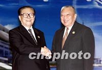 圖:江澤民迎接中國(guó)香港特別行政區(qū)行政長(zhǎng)官 2001年10月21日 11:35 ![]() 10月20日,中國(guó)國(guó)家主席江澤民在上海國(guó)際會(huì)議中心迎接中國(guó)香港特別行政區(qū)行政長(zhǎng)官董建華。中新社圖 |