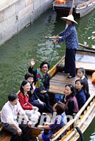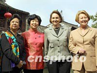組圖:APEC首腦配偶暢游“中國(guó)第一水鄉(xiāng)” 2001年10月21日 14:37 ![]() 香港特別行政區(qū)長(zhǎng)官董建華的夫人趙洪娉十月二十一日與參加上海APEC領(lǐng)導(dǎo)人峰會(huì)的首腦夫人一起在水鄉(xiāng)周莊游船,圖為她向岸邊的市民招手。中新社記者 潘索菲 攝 ![]() APEC首腦夫人21日暢游“中國(guó)第一水鄉(xiāng)”。香港特首夫人趙洪娉(左)、加拿大克雷蒂安總理夫人艾琳·克雷蒂安(右二)、澳大利亞霍華德總理夫人珍妮特·霍華德(右)與陪同游玩的江蘇省副省長(zhǎng)張連珍在周莊一起合影。中新社記者 潘索菲 攝