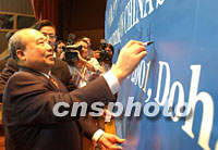 圖:石廣生簽名留念 2001年11月12日 02:45 ![]() 石廣生部長于北京時間12日在多哈簽署中國入世議定書后,在會場橫幅上簽名留念,記錄下這一歷史時刻。中新社記者 錢興強(qiáng) 攝 |