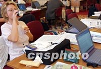 圖:各國記者關注中國入世簽字儀式 2001年11月12日 11:18 ![]() 第四屆WTO部長會議十一晚舉行中國入世簽字儀式和通過臺灣加入世貿組織時,各國記者在新聞中心緊張工作。圖為一名女記者邊用餐邊寫稿。中新社記者 錢興強 攝 |