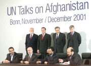圖文:波恩會談結(jié)束 阿富汗四方簽署分權(quán)協(xié)議 2001年12月05日 19:45 ![]() 四方代表簽署協(xié)議 中新網(wǎng)北京12月5日消息:阿富汗4方代表于當(dāng)?shù)貢r間5日上10時10分,在波恩附近的彼得斯貝格賓館簽署了關(guān)于成立阿富汗臨時政府的協(xié)議,波恩會談在近9天馬拉松式的談判后終于落下帷幕。 根據(jù)協(xié)議,阿富汗南部普什圖族領(lǐng)導(dǎo)人薩耶德·哈米德·考爾紹伊將出任臨時行政當(dāng)局主席一職,北方聯(lián)盟則占據(jù)了臨時行政當(dāng)局中負(fù)責(zé)內(nèi)政、外交和國防等事務(wù)的關(guān)鍵職位。臨時政府由29名成員組成,本月22日起運作,任期6個月。 考爾紹伊曾在20世紀(jì)90年代出任過阿富汗副外長,他目前正在阿富汗坎大哈市附近指揮部隊與塔利班士兵作戰(zhàn)。 德國總理施羅德說,協(xié)議的達(dá)成顯示國際社會有勇氣和能力解決所面臨的復(fù)雜問題,他希望會談各方能夠切實履行所達(dá)成的協(xié)議。他說,協(xié)議為阿富汗重建創(chuàng)造了必要的前提,德國將和其他歐盟國家一道,為阿富汗戰(zhàn)后重建提供“實質(zhì)性”的幫助。 在多方壓力下,參加阿富汗問題會談的各方代表經(jīng)過4日晚通宵達(dá)旦的艱苦談判,終于在5日清晨就組成臨時政府的人選問題取得一致,從而為協(xié)議的最終簽署鋪平了道路。 |