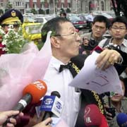 圖文:一討債公司老板向呂秀蓮求婚遭警方攔下 2001年12月11日 13:51 ![]() 呂秀蓮(資料圖片) ![]() 董念臺(tái)11日捧著99朵紅玫瑰,率領(lǐng)48輛豪華禮車,浩浩蕩蕩去向心儀許久的呂秀蓮求婚,但遭警方攔下。董念臺(tái)說不能阻止他求婚的意志。(張良一攝) 中新網(wǎng)香港12月11日消息:臺(tái)北訊,臺(tái)灣一討債公司負(fù)責(zé)人董念臺(tái)今天上午演出向呂秀蓮“求婚記”,不過求婚車隊(duì)在途中即遭到臺(tái)北市警察局?jǐn)r下,董念臺(tái)在不滿下憤而離去。 據(jù)“中央社”報(bào)道,對于今天的求婚之舉,董念臺(tái)稱,他欣賞呂秀蓮憨直、有話直說的個(gè)性,他認(rèn)為呂是位優(yōu)秀的女性。 上午九時(shí)許,由十二輛奔馳、十二輛卡迪拉克高級轎車組成的車隊(duì)從臺(tái)北市中正紀(jì)念堂出發(fā),浩浩蕩蕩準(zhǔn)備到“總統(tǒng)府”“求婚”。 車隊(duì)在抵達(dá)“總統(tǒng)府”前的貴陽路遭轄區(qū)員警攔下,董念臺(tái)穿著燕尾服,手上拿著九十九朵玫瑰和一封求婚信件,他不滿指出,他與呂秀蓮男女未婚,答應(yīng)求婚與否固然是女方的權(quán)利,但求婚也是他的自由,這是人民應(yīng)有的民主法治。 董念臺(tái)說,如果說他妨礙交通,事前他已去函臺(tái)北市警局,但警方并未制止,現(xiàn)在又說他違反“集會(huì)游行法”,他認(rèn)為是警方違法在先。 稍后,董念臺(tái)認(rèn)為既然高攀不起,憤而將玫瑰花扔在地上后離去。 相關(guān)報(bào)道:真情?搞笑?臺(tái)灣一討債公司老板向呂秀蓮求婚 |