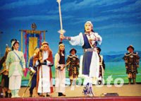 圖:金庸小說《射雕英雄傳》搬上京劇舞臺 2001年12月11日 17:27 ![]() 武漢市京劇團根據(jù)金庸的武俠小說《射雕英雄傳》改編而成的同名京劇,十二月十日晚在南京大行宮會堂成功上演,成為第三屆中國京劇節(jié)唯一的一臺武俠劇。原著中描寫高深莫測的武功借助京劇中的“出手”及現(xiàn)代特技,得到了較好表現(xiàn)。中新社圖 劉小楚 攝 |