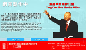 圖文:董建華競選網(wǎng)站將推出 可與市民電郵互動 2002年01月15日 15:02 ![]() 董建華的競選網(wǎng)站目前仍在建設(shè)中。 中新網(wǎng)香港1月15日消息:香港行政長官董建華的競選網(wǎng)站()將在本星期面世,目前網(wǎng)頁的設(shè)計已大致完成,現(xiàn)正進(jìn)行測試。 網(wǎng)站的主要內(nèi)容則包括介紹董建華生平、董宣布參選連任時的演辭撮要、辦公室發(fā)出的新聞稿、辦公室安排的競選活動、與市民的互動電郵服務(wù)等。 董建華競選辦公室公關(guān)組副主任楊志剛表示,在競選網(wǎng)站上有互動“電郵”連結(jié),市民一按便可以直接聯(lián)系到他們,發(fā)表意見。 董建華于2001年12月13日正式宣布參加競選第二任香港特別行政區(qū)行政長官。 |
