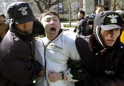 布什來訪前韓民間團體警告美國不要強售戰(zhàn)機(圖) 2002年02月19日 15:00 ![]() 一名抗議布什訪問的韓國學生被警察帶走 中新網北京2月19日消息:美國總統(tǒng)布什今天即將抵達韓國首都漢城與金大中總統(tǒng)舉行會談,韓國軍隊和警察處于高度戒備狀態(tài)。 韓國官員表示,一些民間和學生團體已經計劃好在布什訪問時舉行集會和游行示威活動。 數個民間團體今天警告美國不要對韓國施壓,在兩國首腦會談期間要求購買美國波音公司的F-15戰(zhàn)斗機。 這六個民間團體發(fā)表聯(lián)合聲明說:“F-15戰(zhàn)斗機正在被淘汰。政府不應該購買F-15這種即將停產的機型!