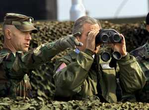 布什視察都羅山車站 稱南北鐵路是和平之路(圖) 2002年02月20日 14:41 ![]() 布什在非軍事區(qū)用望遠鏡觀望朝鮮一側(cè)(美聯(lián)社) 中新網(wǎng)北京2月20日消息:韓國總統(tǒng)金大中和來訪的美國總統(tǒng)布什今天視察都羅山車站。這個車站是金大中希望連接平壤和漢城的鐵路線的北終點站。 據(jù)韓國聯(lián)合新聞社報道,金大中希望借此舉來敦促朝鮮對恢復對話的呼吁作出回應。 在上午的首腦會談中,兩國總統(tǒng)就聽取了這項連接南北的鐵路工程的進度情況簡報。 在舉行聯(lián)合記者招待會后,布什乘直升飛機花費二十分鐘抵達非軍事區(qū)。這個二點五英里寬,一百五十一英里長的區(qū)域布滿地雷,分界線兩側(cè)駐扎著將近朝韓兩百萬軍隊。 美國在韓國保持有三萬七千人的駐軍。布什在抵達時向一名指揮官威廉·米勒中校敬禮致意。 布什在都羅山車站發(fā)表講話。他說:“我們今天相聚在這里,周圍是朝鮮半島和平與穩(wěn)定受到挑戰(zhàn)時的遺跡。金大中總統(tǒng)剛才向我介紹了一條他修建的道路--一條和平之路! 據(jù)路透社報道,布什敦促朝鮮對韓國開放邊境。他說:“這條鐵路可能將這塊分裂的土地兩側(cè)的人民帶到一起來。為了朝鮮半島全體人民的福祉,朝鮮應該完成它! 布什在非軍事區(qū)的講話強硬的措詞中也顯示出靈活性。他甚至在談及朝鮮時仍使用了“邪惡”這個字眼,但他同時也重申了朝鮮對話的建議。 在一個觀察哨所里,布什身穿一件手臂上繡有美國國旗的綠色軍用夾克,通過雙筒望遠鏡從壘著沙袋的地堡內(nèi)觀察朝鮮一側(cè)。