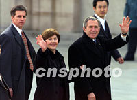 圖文:“空軍一號”平穩(wěn)降落 布什總統(tǒng)飛抵北京 2002年02月21日 10:00 ![]() 美國總統(tǒng)布什與夫人二十一日上午抵達(dá)北京首都國際機(jī)場,開始為期兩天的工作訪問。中新社圖 毛建軍 攝