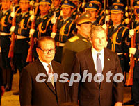 圖:江主席歡迎布什訪華 2002年02月21日 13:01 ![]() 中國(guó)國(guó)家主席江澤民二十一日在北京人民大會(huì)堂舉行儀式,與訪華的美國(guó)總統(tǒng)布什檢閱解放軍三軍儀仗隊(duì)。中新社圖 賈國(guó)榮 攝