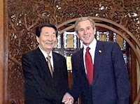 圖:朱镕基會(huì)見(jiàn)來(lái)訪的美國(guó)總統(tǒng)布什 2002年02月22日 13:54 ![]() 中國(guó)國(guó)務(wù)院總理朱镕基二十二日在北京釣魚臺(tái)國(guó)賓館會(huì)見(jiàn)來(lái)訪的美國(guó)總統(tǒng)布什。