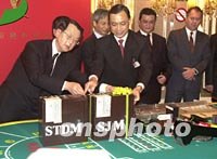 組圖:澳門博彩股份有限公司正式接手11間賭場 2002年04月02日 16:14 ![]() 澳門博彩股份有限公司一日凌晨正式接手經(jīng)營澳門旅游娛樂有限公司屬下的十一間賭場,新的博彩合約正式生效。圖為兩家公司于零點時分在賭場交接。中新社記者 宗金柱 攝
