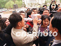 圖:在京媒體密切關(guān)注國航墜機事件 2002年04月15日 20:04 ![]() 15日,中國國航班機墜毀的消息傳出后,國航官員向守候在首都機場辦公樓外的各國媒體分發(fā)材料時,被團團圍住。中新社記者 鄭萍萍 攝