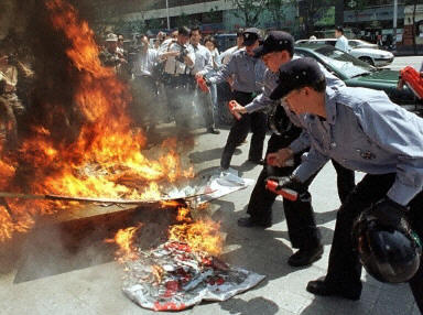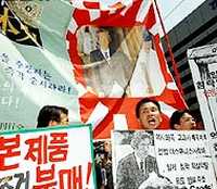 圖文:韓國民間團(tuán)體集會抗議日本首相靖國參拜 2002年04月22日 16:07 ![]() 韓國在日本戰(zhàn)爭中的受害者,強(qiáng)烈抗議日本首相參拜靖國神社。圖為在漢城韓國警察試圖熄滅抗議者燃燒的日本旗幟。法新圖