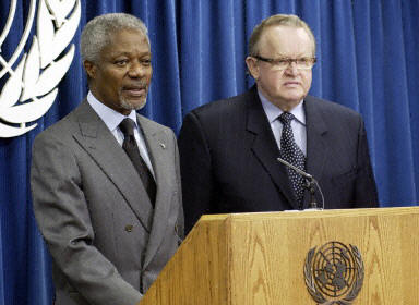 聯(lián)合國(guó)秘書(shū)長(zhǎng)安南任命杰寧難民營(yíng)真相調(diào)查團(tuán)(圖) 2002年04月23日 09:47 聯(lián)合國(guó)秘書(shū)長(zhǎng)安南與芬蘭前總統(tǒng)阿赫蒂薩里在新聞發(fā)布會(huì)上。(法新圖) 中新網(wǎng)北京4月23日消息:聯(lián)合國(guó)秘書(shū)長(zhǎng)安南星期一說(shuō),芬蘭前總統(tǒng)阿赫蒂薩里將率領(lǐng)調(diào)查團(tuán),前往西岸巴勒斯坦城市杰寧的難民營(yíng)。 據(jù)德新社報(bào)道,安南表示這是根據(jù)聯(lián)合國(guó)安理會(huì)的決議作出的決定。安理會(huì)上周對(duì)美國(guó)的提議進(jìn)行表決,決定向杰寧難民營(yíng)派出調(diào)查團(tuán),調(diào)查有關(guān)以色列制造屠殺的指控。 聯(lián)合國(guó)前難民事務(wù)專(zhuān)員日本人緒方貞子和國(guó)際紅十字會(huì)前主席瑞士人索馬魯加都將參加這個(gè)調(diào)查團(tuán),退役的美國(guó)將軍威廉·納什和曾經(jīng)領(lǐng)導(dǎo)過(guò)駐波斯尼亞聯(lián)合國(guó)警察部隊(duì)的愛(ài)爾蘭人菲茨杰拉德將擔(dān)任調(diào)查小組的軍事顧問(wèn)。 安南表示:“這個(gè)小組的成員都是經(jīng)驗(yàn)豐富,具有較高水準(zhǔn)的專(zhuān)業(yè)人士。我需要有一個(gè)具有獨(dú)立意志的調(diào)查小組!