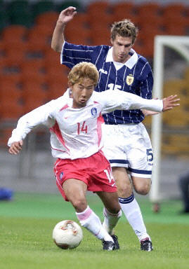 4-1完美屠戮蘇格蘭隊(duì) 太極虎韓國(guó)熱身也瘋狂(圖) 2002年05月16日 22:21 ![]() 李天秀為韓國(guó)隊(duì)敲開勝利之門 中新網(wǎng)漢城5月16日消息:在剛剛結(jié)束的一場(chǎng)世界杯熱身比賽中,東道主之一的韓國(guó)主場(chǎng)發(fā)揮神勇,以4-1完美“屠殺”了前德國(guó)國(guó)家隊(duì)主教練福格茨執(zhí)教的蘇格蘭隊(duì),從而完成了6場(chǎng)熱身不敗。其中李天秀成為場(chǎng)上最耀眼的明星,他的第一個(gè)進(jìn)球堪稱世界級(jí),而安貞煥則梅開二度。韓國(guó)隊(duì)的另外一個(gè)入球由尹晶煥完成,蘇格蘭隊(duì)由首次入選國(guó)家隊(duì)的多比打入一粒安慰性入球。 蘇格蘭由于沖擊世界杯失利,球隊(duì)面臨著重組。在福格茨上任后在上個(gè)月的第一場(chǎng)國(guó)家隊(duì)比賽中,就以0-5慘敗給法國(guó)隊(duì)。在與韓國(guó)隊(duì)的比賽中,由于多名主力因傷缺陣,因此球隊(duì)的實(shí)力又打了折扣。 比賽的僵局在第15分鐘就打破,號(hào)稱韓國(guó)“天才新秀”的李天秀得到后場(chǎng)長(zhǎng)傳后,利用嫻熟的個(gè)人技術(shù)盤過了幾名防守隊(duì)員后,又帶球過了門將,在對(duì)方最后一名后衛(wèi)的干擾下,冷靜的將球鏟射入網(wǎng)。 一球領(lǐng)先的韓國(guó)隊(duì)得勢(shì)不饒人,四分鐘之后,李天秀在左邊的射門稍稍偏出。隨后,李榮杓傳球給黃善洪,對(duì)方門將在撲了一下后球險(xiǎn)些滾入大門。相對(duì)而言,蘇格蘭則顯得沒有多少機(jī)會(huì)。 下半場(chǎng)希丁克用在意大利佩魯賈俱樂部效力的安貞煥換下了老將黃善洪。安貞煥很快就表現(xiàn)出過人的實(shí)力,他在第57分鐘一腳有力的遠(yuǎn)射將球打進(jìn)。第67分鐘,同樣替補(bǔ)上場(chǎng)的中場(chǎng)尹晶煥同樣在禁區(qū)外抽射,將比分?jǐn)U大為3比0。第74分鐘,卡首次出場(chǎng)的蘇格蘭前鋒多比接隊(duì)友開出的任意球,頭球攻門得手。補(bǔ)時(shí)階段,安貞煥以一記精準(zhǔn)的挑射再下一城。 在隨后的比賽中,韓國(guó)還將與英格蘭和法國(guó)隊(duì)進(jìn)行熱身。(宋方燦)