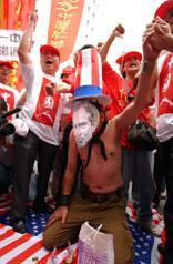 臺北"反臺獨救臺灣"大游行吁當(dāng)局放棄"臺獨"黨綱 2002年05月19日 16:30 ![]() 臺灣中國統(tǒng)一聯(lián)盟5月19日發(fā)起“反臺獨、救臺灣”萬人大游行。民眾以醒目標(biāo)語及旗幟,表達(dá)支持一個中國、反對“臺獨”的立場。(“中央社”圖) ![]() 臺灣中國統(tǒng)一聯(lián)盟5月19日發(fā)起“反臺獨、救臺灣”萬人大游行,在“美國在臺協(xié)會”門前,由一名面戴面具、扮作美國總統(tǒng)布什的男子跪地磕頭,就美國干涉臺海事務(wù)向臺灣民眾道歉。(“中央社”圖) 中新社香港五月十九日電 臺北消息:中國統(tǒng)一聯(lián)盟今天發(fā)起“五一九反臺獨、救臺灣大游行”,數(shù)千臺灣民眾身穿“One China”的紅上衣及紅帽子,高呼“反臺獨、救臺灣”,以表達(dá)他們支持一個中國、反對臺獨的立場。 據(jù)“中央社”報導(dǎo),游行隊伍于下午在臺北“中正紀(jì)念堂”出發(fā),民眾在經(jīng)過美國在臺協(xié)會時高呼“ROT(臺灣共和國),爛!爛!爛!One China,贊!贊!贊!”的口號,部分情緒激動的民眾并向美國在臺協(xié)會投擲雞蛋。 游行活動總領(lǐng)隊、中國統(tǒng)一聯(lián)盟主席王津平,日前在獨派人士的“臺灣正名”游行活動中遭到攻擊而受傷,今天他在游行前發(fā)表演講,抨擊臺灣當(dāng)局兩年來,在民進(jìn)黨臺獨黨綱箝制下,導(dǎo)致兩岸關(guān)系緊張、經(jīng)濟嚴(yán)重衰退、社會混亂不安。 王津平說,今天“反臺獨、救臺灣”大游行的主要訴求,就是呼吁當(dāng)局撤除臺獨黨綱,遵守“一個中國”,回歸“九二共識”。 中新網(wǎng)香港5月19日消息:臺北訊,臺灣中國統(tǒng)一聯(lián)盟今天號召發(fā)起數(shù)十個島內(nèi)“在野”政黨次級團體、反“臺獨”的民眾、車隊共同參與的“519反‘臺獨’、救臺灣萬人大游行”。 此次大游行由中國統(tǒng)一聯(lián)盟主席王津平擔(dān)任總領(lǐng)隊。日前為反制“臺獨”集團的所謂“臺灣‘正名’游行”而遭暴力攻擊并受傷的王津平,在游行出發(fā)前發(fā)表演說指出,陳水扁上臺兩年以來,都因為“臺獨”黨綱箝制當(dāng)局政策發(fā)展,導(dǎo)致兩岸關(guān)系緊張、島內(nèi)嚴(yán)重經(jīng)濟衰退、社會混亂。 此次游行的主要訴求,就是呼吁陳水扁當(dāng)局及民進(jìn)黨撤除“臺獨”黨綱,遵守“一中原則”,回歸“九二共識”,以正式渠道恢復(fù)兩岸談判;立即三通,加速經(jīng)濟互補互利。 此外,游行隊伍向當(dāng)局喊出“反軍購、要福利”、“要顧三通,不要神盾”等口號。 據(jù)悉,游行隊伍也以踐踏美國國旗的方式,表達(dá)對美國介入臺海事務(wù)的強烈不滿。 另外,中國統(tǒng)一聯(lián)盟今晚將在舉辦“中國人團結(jié)之夜”音樂會,呼應(yīng)白天的游行主題。 相關(guān)報道:臺灣中國統(tǒng)一聯(lián)盟控告李登輝及"臺獨"分子施暴 相關(guān)報道:董建華會見臺灣"中國統(tǒng)一聯(lián)盟一國兩制參訪團" 相關(guān)報道:臺灣中國統(tǒng)一聯(lián)盟訪港考察"一國兩制"實施情況 相關(guān)報道:臺灣中國統(tǒng)一聯(lián)盟抗議海外"臺獨"組織在臺興風(fēng)作浪 相關(guān)報道:臺灣“中國統(tǒng)一聯(lián)盟”抗議日相參拜靖國神社 相關(guān)報道:臺灣中國統(tǒng)一聯(lián)盟等十多個團體抗議達(dá)賴訪臺 相關(guān)報道:臺灣中國統(tǒng)一聯(lián)盟座談會指臺灣沒理由抗拒“一國兩制”