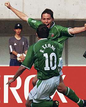 雙方各打半場(chǎng)好球 "雄獅"喀麥隆1-1平愛(ài)爾蘭(圖) 2002年06月01日 16:44 ![]() 愛(ài)爾蘭隊(duì)球員羅比-基恩與隊(duì)友為霍蘭德的進(jìn)球而歡呼。共同社圖 中新網(wǎng)東京6月1日消息:在剛剛在日本新瀉結(jié)束的世界杯外圍賽E組的首回合的第一場(chǎng)比賽中,“非洲雄獅”喀麥隆隊(duì)在領(lǐng)先一球的大好形勢(shì)下,被“綠衣男孩”愛(ài)爾蘭隊(duì)將比分追平,雙方以1-1結(jié)束了比賽。 由于隊(duì)長(zhǎng)羅伊·基恩在世界杯前因?yàn)楹徒叹毑缓投顺,?ài)爾蘭隊(duì)的實(shí)力大打折扣。為此,愛(ài)爾蘭不得不以22人參加世界杯的比賽。而喀麥隆隊(duì)陣容完整,賽前顯得信心十足,表示要學(xué)習(xí)塞內(nèi)加爾好榜樣,全取3分。 上半場(chǎng)喀麥隆隊(duì)表現(xiàn)出色,他們利用嫻熟的個(gè)人技術(shù),不但向愛(ài)爾蘭隊(duì)的腹地發(fā)動(dòng)沖擊。在鋒線上,在比賽中,姆博馬和埃托奧配合默契,給對(duì)手以很大的壓力。相對(duì)而言,愛(ài)爾蘭則遲遲沒(méi)有找到感覺(jué),在比賽中顯得節(jié)奏有些跟不上,顯得很被動(dòng)。比賽僵局在第39分鐘打破,埃托奧在右路利用出色的個(gè)人技術(shù)撕開(kāi)對(duì)手的防線,并且將門將吸引出來(lái),隨后他將球傳給門前的姆博馬,后者一蹴而就,率先破門得手。 此后,一球在手的喀麥隆隊(duì)開(kāi)始有些放松,最終在上半場(chǎng)以1-0結(jié)束該場(chǎng)比賽。在下半場(chǎng),愛(ài)爾蘭隊(duì)開(kāi)始顯示出他們預(yù)選賽淘汰荷蘭隊(duì)的比賽中的素質(zhì),開(kāi)始控制了比賽節(jié)奏。 下半場(chǎng)開(kāi)始7分鐘后,愛(ài)爾蘭人的努力得到回報(bào),由于喀麥隆隊(duì)后衛(wèi)解圍時(shí)出現(xiàn)低級(jí)失誤,將球送到中路愛(ài)爾蘭隊(duì)霍蘭德的腳下,后者迎球怒射,幸運(yùn)的將球送入對(duì)方大門。 此后,愛(ài)爾蘭圍著喀麥隆隊(duì)的大門狂轟濫炸,其中一次射門擊中門柱,但是只開(kāi)花不結(jié)果,最終雙方以1-1握手言和。 愛(ài)爾蘭(442):吉文;凱利,哈特(77分鐘,雷德),斯湯頓,布林;麥卡蒂爾(46分鐘,菲南),霍蘭德,基爾巴尼,金塞拉;達(dá)夫、羅比-基恩 喀麥隆(3-5-2):門將:阿利烏姆;沃姆,宋,卡拉;查托,格雷米,勞倫,福,奧萊姆貝;埃托奧、姆博馬(69分鐘,蘇佛)