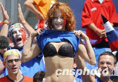 圖:法國瘋狂女球迷看臺上掀起上衣 2002年06月11日 14:38 ![]() 6月11日下午,韓日世界杯A組丹麥隊與法國隊的比賽在韓國仁川文鶴體育場進(jìn)行,圖為法國瘋狂女球迷看臺上掀起上衣。