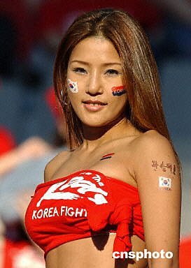 圖:性感女球迷關(guān)注韓德之戰(zhàn) 2002年06月25日 18:47 ![]() 2002韓日世界杯半決賽第一場(chǎng)比賽韓國(guó)隊(duì)與德國(guó)隊(duì)的比賽將于6月25日晚在漢城進(jìn)行,圖為韓國(guó)女球迷性感亮相。