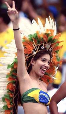 圖:巴德決戰(zhàn)開(kāi)始 巴西美女為巴西隊(duì)助威 2002年06月30日 19:04 ![]() 北京時(shí)間6月30日19:00,2002韓日世界杯決賽巴西隊(duì)與德國(guó)隊(duì)的比賽在日本橫濱國(guó)際競(jìng)技體育場(chǎng)進(jìn)行。圖為看臺(tái)上的巴西女球迷。共同社圖