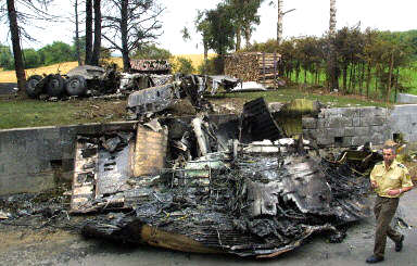 圖文:一警官?gòu)膲嫐У膱D-154殘骸前經(jīng)過(guò) 2002年07月03日 14:30 德國(guó)當(dāng)?shù)貢r(shí)間7月1日夜(北京時(shí)間2日晨),一架DHL公司的波音757貨機(jī)和俄羅斯巴什基爾航空公司的圖-154客機(jī)在德國(guó)巴登-符騰堡州于伯林根鎮(zhèn)上空相撞并墜毀,造成71人死亡,其中包括52名兒童。圖為一名警官?gòu)膲嫐У膱D-154殘骸前經(jīng)過(guò)。(春風(fēng))