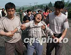 目擊:白山市江源縣“七·四”礦難大救援側(cè)記 2002年07月05日 16:03 ![]() 三十九名礦工被困井下生死不明,其家屬聞?dòng)嵑蟊从^。目前搶救工作正在緊張進(jìn)行中。吳兆飛 攝 中新社白山七月五日電題:為了井下三十九名礦工兄弟 ——白山市江源縣“七·四”礦難大救援側(cè)記 作者 吳兆飛 祝子眾 程澤 記者趕到白山市江源“七·四”煤礦瓦斯爆炸事故現(xiàn)場已過中午,距事故發(fā)生已十幾小時(shí),現(xiàn)場目睹了“七·四”礦難的緊張有序的救援工作。 發(fā)生事故的富強(qiáng)煤礦從一九九六年開始采煤。二OOO年三月四日中午十二時(shí)三十分,隨著瓦斯爆炸的轟隆巨響,二十一名礦工永遠(yuǎn)告別了這個(gè)世界。而今天,又有三十九條生命在這里懸于一線。 富強(qiáng)煤礦東側(cè)有一個(gè)大煤堆,上面有纜繩、礦車等設(shè)備。主井坐落在煤礦兩側(cè),這里聚集著四十多名礦工,正在緊急救援。在主井旁邊,記者看到四十多名工人分成三組:一組集中在塌方的坑道里,正在向外轉(zhuǎn)移塌下來的泥土、石塊、支柱和橫梁;一組聚集在坑道一側(cè),將扔上來的泥沙運(yùn)走;一組分散在四周,用礦車向外搬運(yùn)塌方的泥石、木材等。 記者在現(xiàn)場看到悲痛萬分的礦工陳在先,他的二哥在此次礦難中被埋在下面。據(jù)陳介紹,他們來自四川簡陽農(nóng)村,是他鼓動(dòng)二哥一起到這里賺錢,本想有個(gè)照應(yīng),沒想到發(fā)生了礦難。他聽到爆炸聲,拼命從住處跑到發(fā)生礦難的井口,當(dāng)時(shí)井口還冒著煙。他邊流淚邊拼命地用手挖土,向外搬石塊!爱(dāng)時(shí)我沒有感到一點(diǎn)疼痛!辈痪么蠹叶稼s來救援。 在井口,記者看到救援人員的臉被煤灰染黑。因?yàn)樘鞖鈵灍,很快汗水成泥淌了下來,不時(shí)迷住雙眼,他們就用袖子擦一下,繼續(xù)揮鍬清理……據(jù)一位剛換下來的救援礦工說,“我們礦工在一起很長時(shí)間了。一日不見,他們就被埋在地下,那可是三十多個(gè)兄弟呀!我們不管付出多大代價(jià)也要把他們找到。” 據(jù)悉,事故發(fā)生后,造成主井口部位十多米的泥石塌方,將井口覆蓋,要想救援,先要清除這里的塌方物。主井東側(cè)還有一個(gè)副井,此時(shí)風(fēng)扇已經(jīng)打開,緊急向外排放瓦斯氣體,坑道有三百多米長,救援的工作人員從副井進(jìn)去以后,走了大約五十延長米,發(fā)現(xiàn)前方塌方嚴(yán)重,再進(jìn)入很可能發(fā)生不測,于是撤出來商量救援對(duì)策。 與井口挖掘搶險(xiǎn)工作同時(shí)進(jìn)行的副井口疏通排氣工作也在緊張進(jìn)行,緊急排放瓦斯爆炸后產(chǎn)生的有毒氣體,并有可能在此井口實(shí)施搶救。當(dāng)記者離開現(xiàn)場時(shí),副井口周圍由于排出的有害氣體的積聚,為了安全,現(xiàn)場已開始疏散除搶救人員以外的工作人員,并嚴(yán)禁攝像、拍照、打手機(jī)等一切可誘發(fā)再次爆炸的不安全舉動(dòng)。 事故發(fā)生后,吉林省副省長李介車帶領(lǐng)白山市、江源縣有關(guān)官員迅速趕赴現(xiàn)場,下到坑道里進(jìn)行巡視,征求有關(guān)專家意見后擬定了初步搶險(xiǎn)方案 目前,事故搶險(xiǎn)工作正在緊張有序地進(jìn)行,礦區(qū)社會(huì)狀況平穩(wěn)。(完)