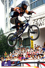 圖:中國(guó)極限精英賽街市決賽 2002年08月12日 16:30 ![]() 北京選手于秒在八月北京舉行的中國(guó)極限精英賽街市決賽中,高空雙手撒把體現(xiàn)了極限運(yùn)動(dòng)的驚險(xiǎn)刺激。作者:史利