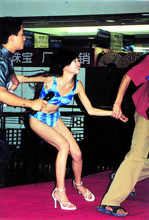 圖文:女模特脫衣推銷 男朋友憤而攪場(chǎng) 2002年08月19日 10:30 ![]() ■長(zhǎng)衫就是“防腐層”■短裙代表“塑料”■脫得只剩內(nèi)衣 ![]() ■男友硬拉模特離場(chǎng) 攝影/趙訓(xùn)成 中新網(wǎng)北京8月19日消息:讀者趙先生昨天給北京青年報(bào)打來(lái)熱線說(shuō),他前天在一個(gè)購(gòu)物廣場(chǎng)看到一個(gè)管道廠家為了讓人們更了解“管道”的內(nèi)部結(jié)構(gòu),竟然讓兩位假扮“管道”的小姐一層一層脫道具服,直到小姐的男友出面干涉才罷休。 趙先生講述了事件的整個(gè)過(guò)程:“當(dāng)時(shí),我在商場(chǎng)購(gòu)物,看見(jiàn)一家管道企業(yè)正在推介產(chǎn)品。兩位扮演‘管道’的女模特當(dāng)著眾人的面脫起衣服,這讓不少觀眾大吃一驚,還有一些母親趕緊捂上孩子的眼睛。這兩位女模特直到露出了穿在里面的內(nèi)衣才停止。忽然,一位女模特的男友出現(xiàn),硬拉女模特要離開,但廠家人員就是不讓,雙方開始爭(zhēng)執(zhí),場(chǎng)面頓時(shí)變得異;靵y! 有關(guān)廣告專家分析說(shuō),讓消費(fèi)者反感的廣告形式有可能抬高了企業(yè)的“知名度”,但是卻降低了產(chǎn)品的“美譽(yù)度”,反而會(huì)給產(chǎn)品銷售帶來(lái)負(fù)面效果。畢竟,消費(fèi)者是否選擇這種產(chǎn)品,最終還是決定于產(chǎn)品質(zhì)量和售后服務(wù),這樣的“秀”還是少做為好。(王旭)