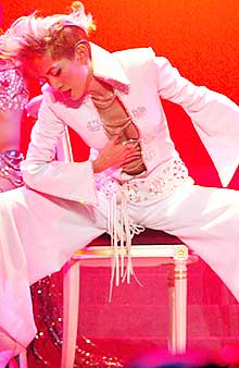 據(jù)此間新明日報(bào)的報(bào)道說,在幾乎滿座的情況下,梅姐載歌載舞,散發(fā)了無窮的熱力。在前半場的表演,梅艷芳猶如展現(xiàn)服裝秀,鱷魚皮大衣,紅色鉆石晚裝等一一亮相于舞臺(tái),另外,就像過去那樣,她的舞臺(tái)動(dòng)作也極盡大膽,在演唱《憑什么》,把麥克積遜的經(jīng)典舞臺(tái)動(dòng)作重演一遍,雙手在身體敏感部位游動(dòng)及觸摸,讓人看了臉紅耳赤。