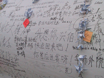 為了紀(jì)念這五位遇難同學(xué),北京大學(xué)還在百周年紀(jì)念講堂東廳設(shè)立了靈堂,北京大學(xué)黨委書記閔維方、校長許智宏等人于今天下午四點(diǎn)前往哀悼。山鷹社平日訓(xùn)練的人工巖壁前也成了祭奠的場所,人們?cè)谀抢飻[放花束、花圈,寄托哀悼之情。
