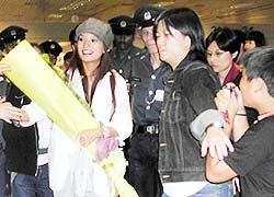 兩大機場搭客大廈皆出動多名保安,但縱觀兩邊聲勢,趙薇抵步時,七八十名影迷洶涌而上,還得保安警察圍成人墻“護駕”。反之,前往為舒淇接機的影迷寥寥可數(shù),舒淇走得優(yōu)哉閑哉,意圖夾道的保安警察可謂英雄無用武之地。