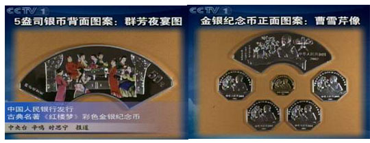 據(jù)央視16點新聞報道,該套紀念幣正面圖案均為《紅樓夢》作者曹雪芹像,并刊有國名和年號。1/2盎司金幣背面圖案為湘云醉眠圖,面額200元,發(fā)行量8000枚;1盎司銀幣共4枚,面額均為10元,發(fā)行量均為38000枚,背面圖案分別為:元春歸省圖、惜春作畫圖、熙鳳弄權(quán)圖、寶釵撲蝶圖;5盎司銀幣背面圖案為群芳夜宴圖,面額50元,發(fā)行量11800枚。