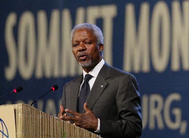姆貝基、安南、第五十六屆聯(lián)大主席韓升洙先后在開幕式上致辭。安南在講話中呼吁,國際社會特別是發(fā)達國家應該為地球、為未來負起責任。他說,本次會議的重點集中在人類與自然資源的關系上。目前,氣候變化、污染、漁業(yè)資源的損耗等環(huán)境問題已經讓人無法視而不見。