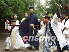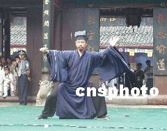 來自武當派的英杰,由原太和宮主持、武當?shù)澜涛幕芯繒䲡L游玄德宗師掌門率隊。武當派高手袁理敏、游小龍、游尊龍、周理參、黃理安等赴賽。著一身道服,頭戴莊子帽的游玄德在臺上將武當秘傳太極拳和神秘的內(nèi)家功夫?qū)崙?zhàn)演藝首次公開亮相,幾個招式,便贏得滿場喝彩。武當派內(nèi)家祖庭十五代弟子游小龍的武當醉八仙劍,演示得似醉非醉、云里霧里、劍法凌厲多變。