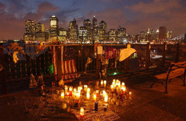 2001年9月20日,911恐怖事件發(fā)生一周后,紐約布魯克林區(qū)和曼哈頓中間的東河岸邊,擺滿了紀念死難者的蠟燭。(春風)
