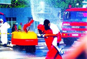 很快,消防隊(duì)員確定出染毒區(qū)和警戒區(qū),警戒哨兵立即站到崗上,阻止車輛、人員進(jìn)入染毒區(qū)域,防止二次染毒。不同類型的洗消帳篷被迅速充氣建起,中毒人員被送入其中進(jìn)行洗消、救治。大水罐車噴射霧狀水流和水幕,稀釋降毒,防止毒氣向安全區(qū)擴(kuò)散,掩護(hù)現(xiàn)場救援。