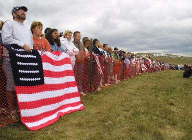 在匹茨堡東南70英里的阿帕拉奇安高低的這片露天礦上,聚集了數(shù)千名民眾,包括500多名遇難者的家屬。他們很多人飽含熱淚,在陰沉的天空下緊握著美國國旗。當?shù)貢r間上午10:00,正是一年前那架波音757客機以大約500英里的時速墜毀在這片空地上。當被美國總統(tǒng)布什譽為英雄的33名遇難乘客和7名殉職的機組人員名單被宣讀時,一座百年歷史的教會鐘悠然響起。