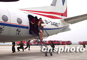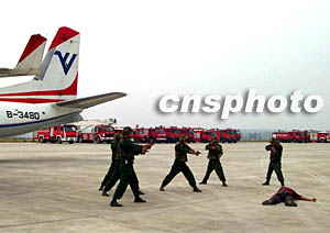 演練在下午二點十分開始:一架由廣州飛往綿陽的運七航班飛機被兩名“歹徒”劫持,機上共有乘客五十名。一名持刀“歹徒”挾持婦女為人質,另一“歹徒”聲稱攜帶有炸彈,索要人民幣二百萬元。當?shù)毓矙C關接到報警后,馬上采取了緊急救援程序。武警、巡警、刑警、消防等相關部門近千名警員、近百輛警車和特種車輛,在二十分鐘內集結到位,對機場進行了封鎖和控制。