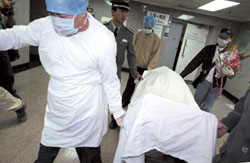 20日零時35分,高楓的父母在別人的攙扶下離開病房,表情十分凝重。20日1時4分,高楓遺體從病房中推出,送至太平間區(qū)的告別室。(張學軍、翟佳)