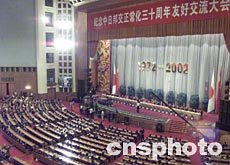 紀(jì)念中日邦交正常化三十周年友好交流大會(huì)今晚在人民大會(huì)堂舉行。一萬(wàn)三千余名日本來(lái)賓會(huì)聚于此,與中方各界人士共同紀(jì)念這個(gè)對(duì)兩國(guó)人民都具有重要意義的日子。會(huì)上,江澤民主席代表中國(guó)政府和人民并以他個(gè)人的名義對(duì)這次活動(dòng)的成功舉辦表示祝賀,向參加活動(dòng)的各位日本朋友表示歡迎。