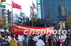 當?shù)貢r間九月二十九日中午,在熱鬧的紐約法拉盛緬街上,飄揚起一面五星紅旗。紐約華人今天在此舉行升旗儀式,慶祝中華人民共和國成立五十三周年。作者:趙海燕