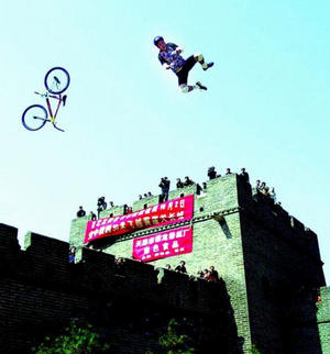 昨天中午12點左右,助威的現(xiàn)場歌舞表演結(jié)束后,在場的所有觀眾都集中在了黃崖正關(guān)廣場的東側(cè),所有的目光都注視在飛越挑戰(zhàn)者身上。大約10分鐘后,王會海第一個沖下高35米、長76米的下滑跑道,剎那間人車一同飛過長城,并安全落地。隨后身材魁梧的王家雄在總指揮的一聲令下后也騎著自行車沖下跑道,然而就在越過長城的時刻,王家雄與自行車分離。在記者的鏡頭前,年僅30歲的王家雄留下了最后的身影。他的身體在長城上劃過時,自行車下墜撞到長城的頂沿并彈過城墻落在地面緩沖區(qū)的防護(hù)墊上,而王家雄卻飛向緩沖區(qū)域之外的綠化草叢中,當(dāng)即昏迷不醒。