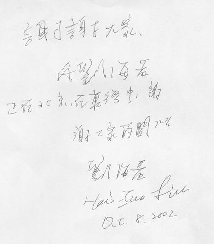 進入10月以來,海若已能夠用文字表達自己的感情。在一張紙上,海若寫道:“謝謝大家。我是劉海若,正在北京康復中。謝謝大家的關(guān)心!辈⒂弥杏⑽膶懴伦约旱拿。在另一張紙上,海若寫道:“很想念大家,希望大家幸?鞓贰N液芸旎氐焦ぷ鲘徫缓痛蠹乙娒。聽說小莉要生寶寶了,祝她們健康幸福!