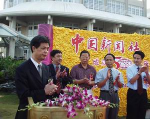 中新社總編輯郭招金在慶典上致辭。他說(shuō),中新社是中國(guó)兩家通訊社之一,成立于一九五二年九月十四日,主要為港澳同胞、臺(tái)灣同胞、華人華僑服務(wù)。目前,中新社在中國(guó)內(nèi)地的二十五個(gè)省、自治區(qū)、直轄市設(shè)有五十六個(gè)分社、支社、記者站。在香港、澳門特別行政區(qū),在美國(guó)、澳大利亞、日本、法國(guó)、泰國(guó)建有分支機(jī)構(gòu)。現(xiàn)在中新社每天播發(fā)新聞電訊稿一百余條,傳真圖片三十多張,中國(guó)新聞網(wǎng)每天更新新聞四五百條,中國(guó)新聞圖片網(wǎng)每天更新新聞圖片一百多幅,向海外幾十家報(bào)紙?zhí)峁⿲8搴椭谱魇邆(gè)報(bào)紙版面。