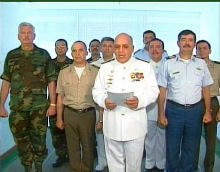 ![]() 當?shù)貢r間4月11日,委內(nèi)瑞拉海軍參謀長拉米雷茲-佩雷斯(前方著白衣者)代表30名軍官通過錄像帶宣布,不承認查韋斯總統(tǒng)。
