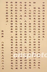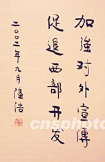 甘肅省省長陸浩為中新社成立五十周年題詞:加強對外宣傳,促進西部開發(fā)。