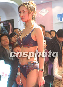 圖:北京國際內(nèi)衣世界展上模特展示性感內(nèi)衣