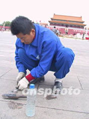 近日來(lái),邊清理邊增加的天安門(mén)廣場(chǎng)口香糖污染問(wèn)題引起媒體關(guān)注。短短幾天時(shí)間內(nèi),廣場(chǎng)上就產(chǎn)生了60多萬(wàn)塊口香糖垃圾。有的地方不到一平方米的地面竟然有9塊口香糖污漬。神圣和莊嚴(yán)的天安門(mén)廣場(chǎng)竟布滿密密麻麻的口香糖斑痕。