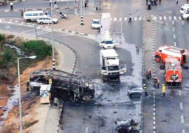 以色列電視和電臺(tái)報(bào)導(dǎo)說(shuō),一輛吉普類型的汽車在以色列巴德卡納鎮(zhèn)駛向一輛公車旁并引爆,汽車上載有炸藥和數(shù)罐汽油,還坐有兩人。