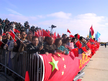 中資機構和當?shù)厝A人華僑、留學生代表數(shù)百人到機場歡迎江主席一行 中新社記者 呂振亞 攝