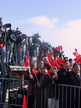 訪問期間,江澤民主席將與布什總統(tǒng)舉行會(huì)晤,就雙邊關(guān)系和其他共同關(guān)心的問題深入交換看法。美國和各國駐美新聞機(jī)構(gòu)均對(duì)江澤民此次訪問給予極大關(guān)注。圖為江澤民抵達(dá)芝加哥奧海爾國際機(jī)場時(shí)記者爭先采訪的現(xiàn)場。